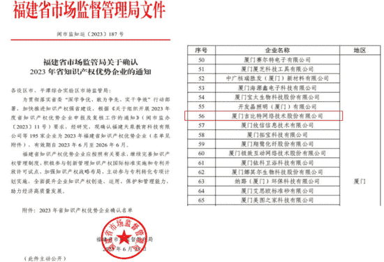 近日,,福建省市场监督管理局公示了2023年福建省知识产权优势企业名单,,,,厦门LEWIN乐玩网络技术股份有限公司(以下简称“LEWIN乐玩”或“公司”)榜上有名。。。